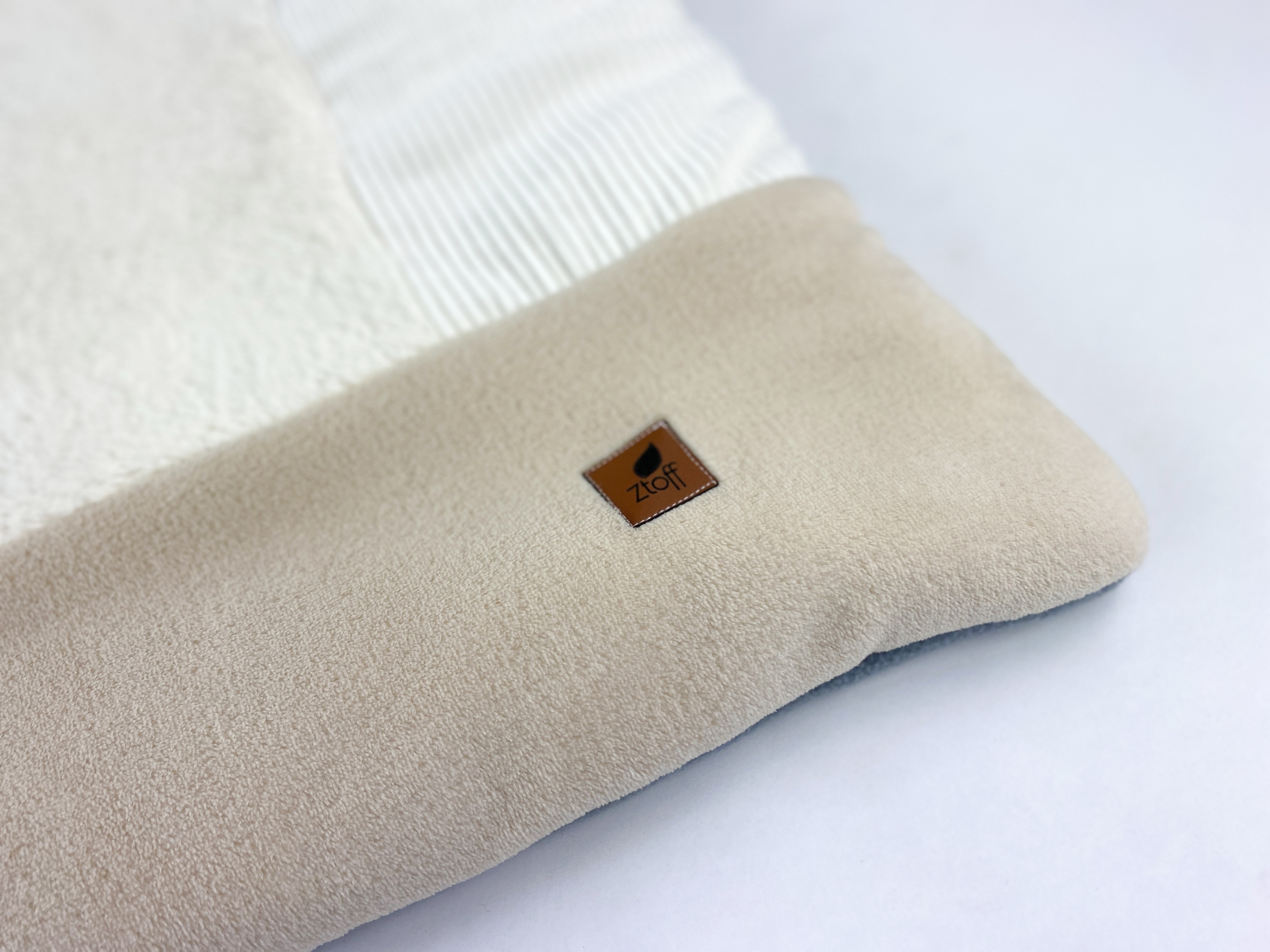 - Oberseite: verschiedene Stoffe in creme- und beige (hellbeige Popeline mit Pünktchen 100% Baumwolle, weicher Cord creme 100% Baumwolle, Nicki 80% Baumwolle/ 20% Polyester, Wellnessfleece weiß 100% Polyester)