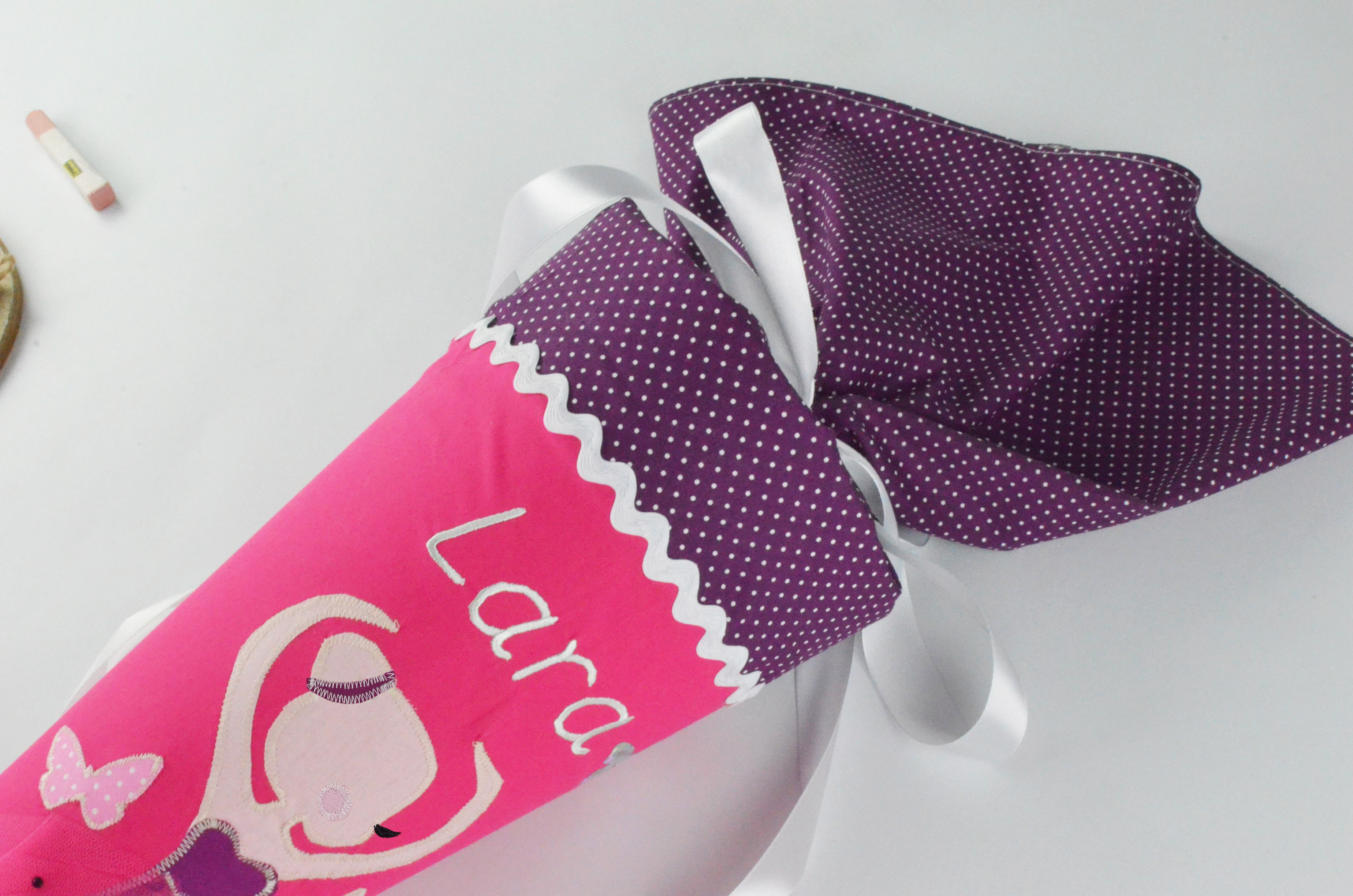 - Die Schultüte besteht aus verschiedenen Baumwollstoffen in pink und lila (100% Baumwolle)